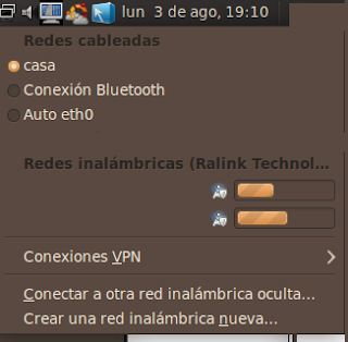 No olvidar conectar el server a la red en mi caso como es una red wifi, click izquierdo sobre el icono de las redes, conectar a otra red inalámbrica oculta, seleccionar el dispositivo de salida y la red que acabamos de crear, en mi caso dansanti.